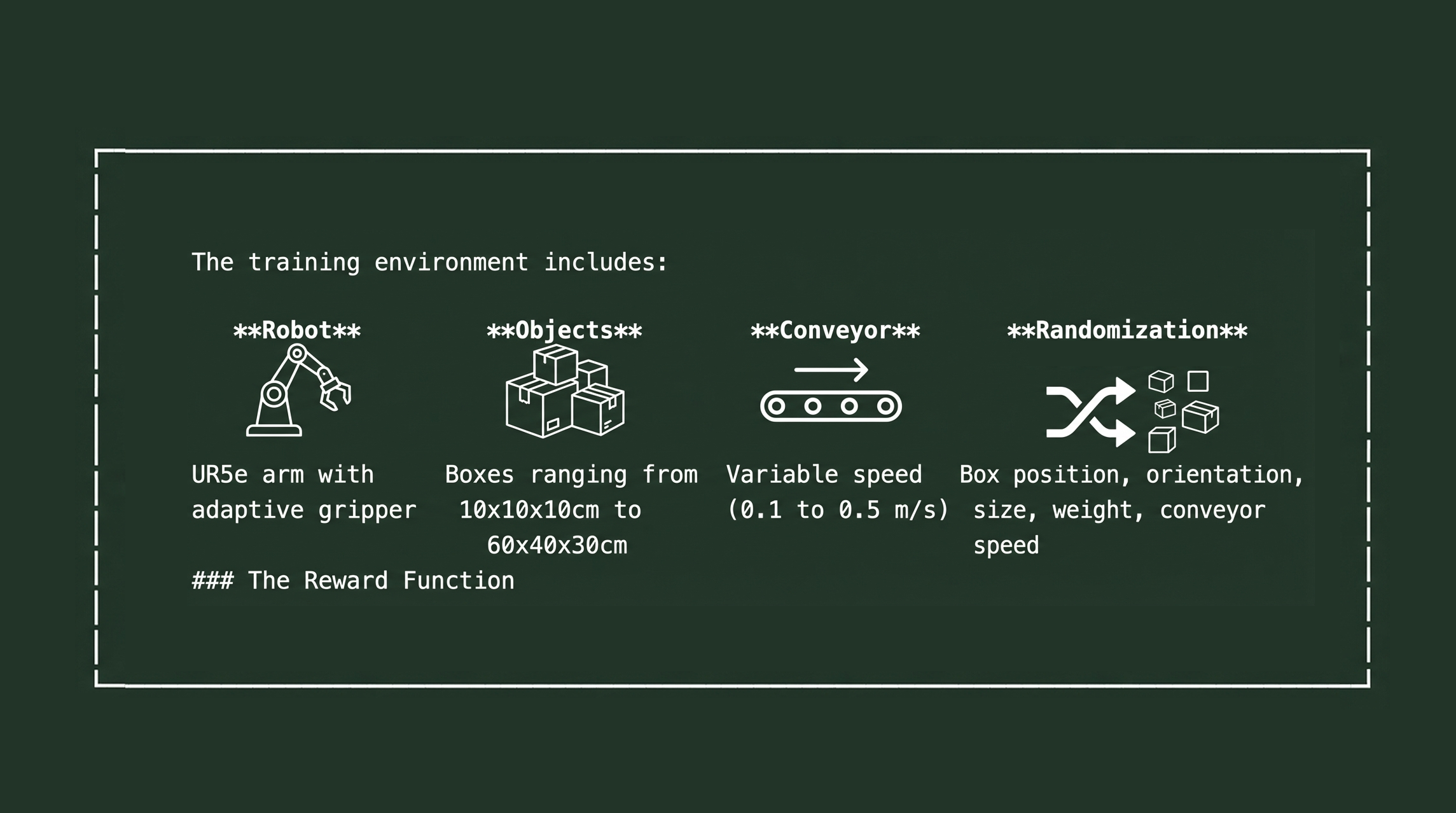 This isn't hypothetical. Our UR7 conveyor demo implements exactly this workflow, training PPO policies that achieve >90% success rates on pick-and-place tasks.