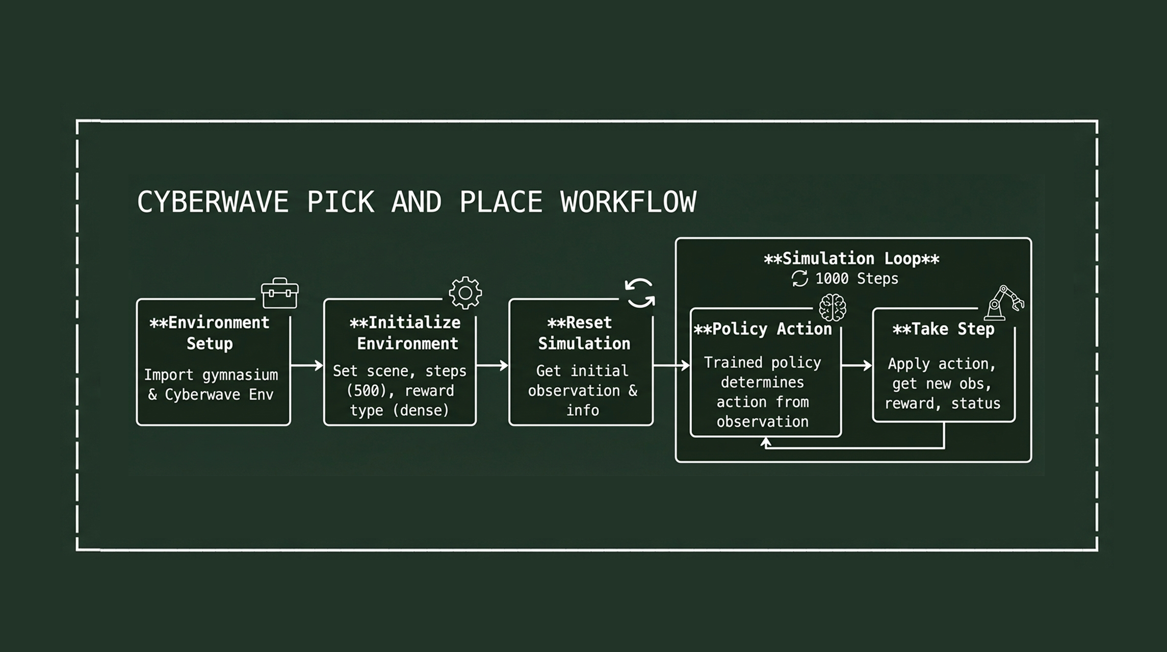 Cyberwave environments are compatible with Gymnasium (the successor to OpenAI Gym)—the standard interface for RL training.