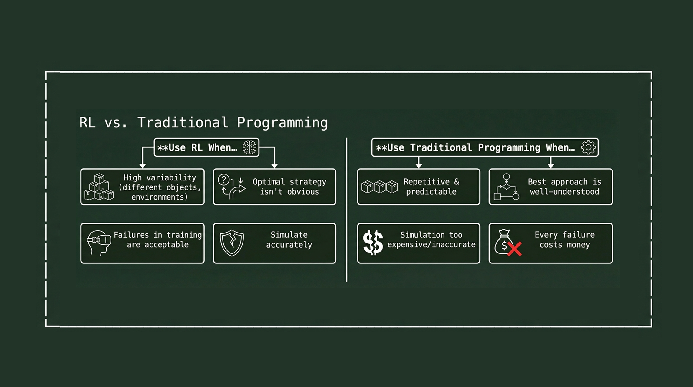 For the packaging example, RL makes sense because the variability is high and simulation is accurate. For a task like "move joint 3 to exactly 45 degrees," traditional control is simpler and more reliable.